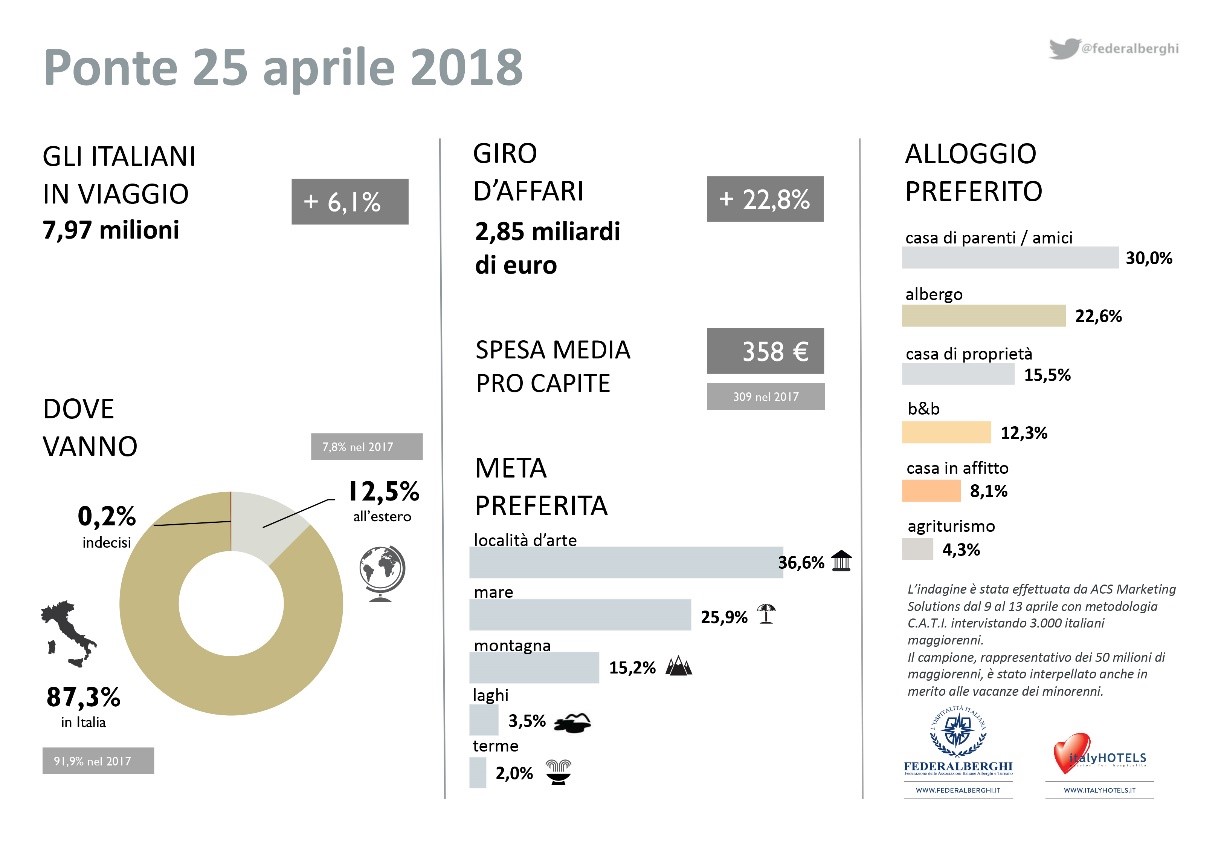 «Un calendario favorevole, in specie nel caso della festa dei lavoratori, che cade di martedì, rende interessante l’occasione di vacanza, che per alcuni assume addirittura la forma del super-ponte – Ha aggiunto il presidente di Federalberghi – Il giro di affari legato al movimento dei ponti primaverili conferma i segnali di ripresa che stanno facendo bene al settore. Tuttavia – aggiunge Bocca – per strutturare al meglio il trend di crescita nel nostro comparto, il quadro di incertezza politica non aiuta». Ma vediamo nel dettaglio cosa è emerso dallo studio di ACS Marketing Solutions.
